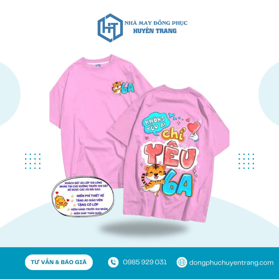 Mẫu áo đồng phục học sinh lớp 6A mang sắc hồng pastel ngọt ngào, dễ thương và cực kỳ nổi bật. Thiết kế in hình chú hổ ngộ nghĩnh kết hợp slogan vui nhộn “Không yêu ai, chỉ yêu 6A” giúp chiếc áo trở thành biểu tượng gắn kết và cá tính riêng của tập thể lớp. Đây là sự lựa chọn tuyệt vời cho những bạn học sinh muốn có một mẫu áo lớp vừa trẻ trung vừa đáng yêu.