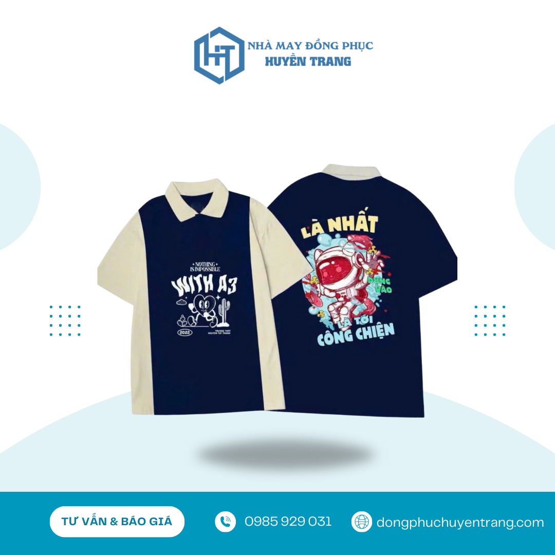 Mẫu áo đồng phục học sinh polo phối màu xanh navy – kem mang phong cách hiện đại, cá tính và nổi bật. Với thiết kế sáng tạo, mặt trước in slogan ngắn gọn, mặt sau là hình in đầy màu sắc kèm khẩu hiệu “Là Nhất Công Chiến”, chiếc áo không chỉ là trang phục đồng phục mà còn thể hiện tinh thần đoàn kết, máu lửa và bản lĩnh của tập thể lớp.