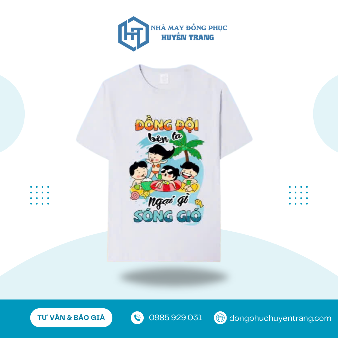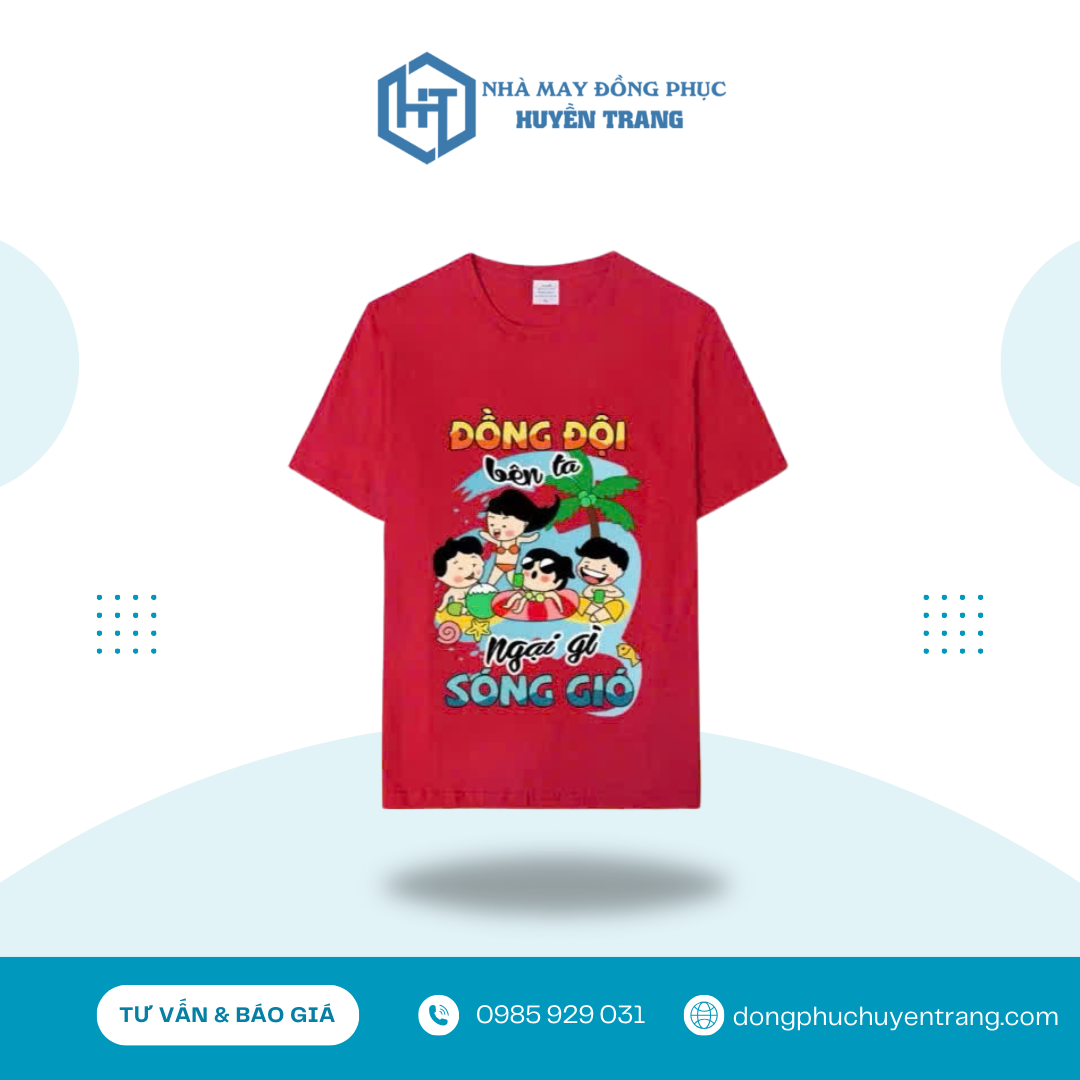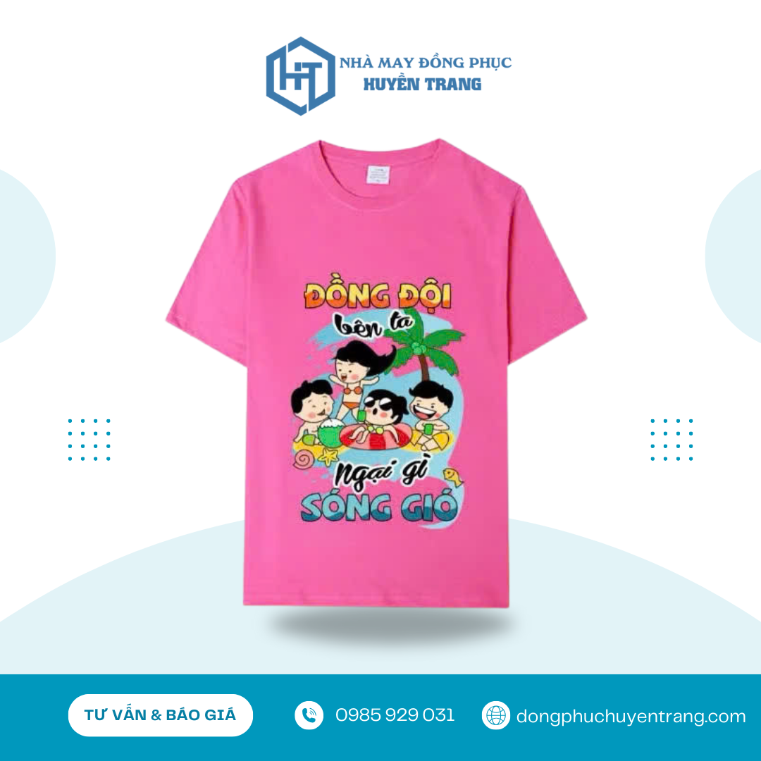 Mẫu áo đồng phục học sinh màu hồng nổi bật mang đến phong cách trẻ trung, dễ thương nhưng cũng đầy cá tính. Với thiết kế hình ảnh vui nhộn và slogan ấn tượng “Đồng đội hơn to, ngại gì sóng gió”, chiếc áo thể hiện tinh thần đoàn kết, dám thử thách và gắn bó bền chặt của tập thể lớp.