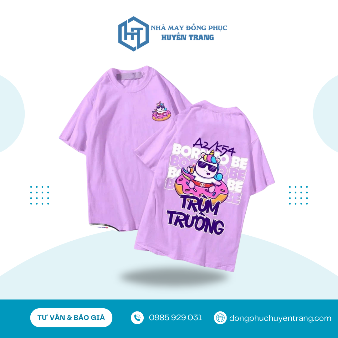 Mẫu áo đồng phục học sinh màu tím pastel mang đến phong cách trẻ trung, đáng yêu nhưng cũng đầy cá tính. Thiết kế độc đáo với hình ảnh chú gấu đáng yêu và slogan “Trùm Trường” tạo nên sự nổi bật, thể hiện tinh thần tự tin, năng động và bản lĩnh của tập thể lớp. Đây chắc chắn là một trong những mẫu áo lớp được học sinh yêu thích để khẳng định chất riêng của mình.